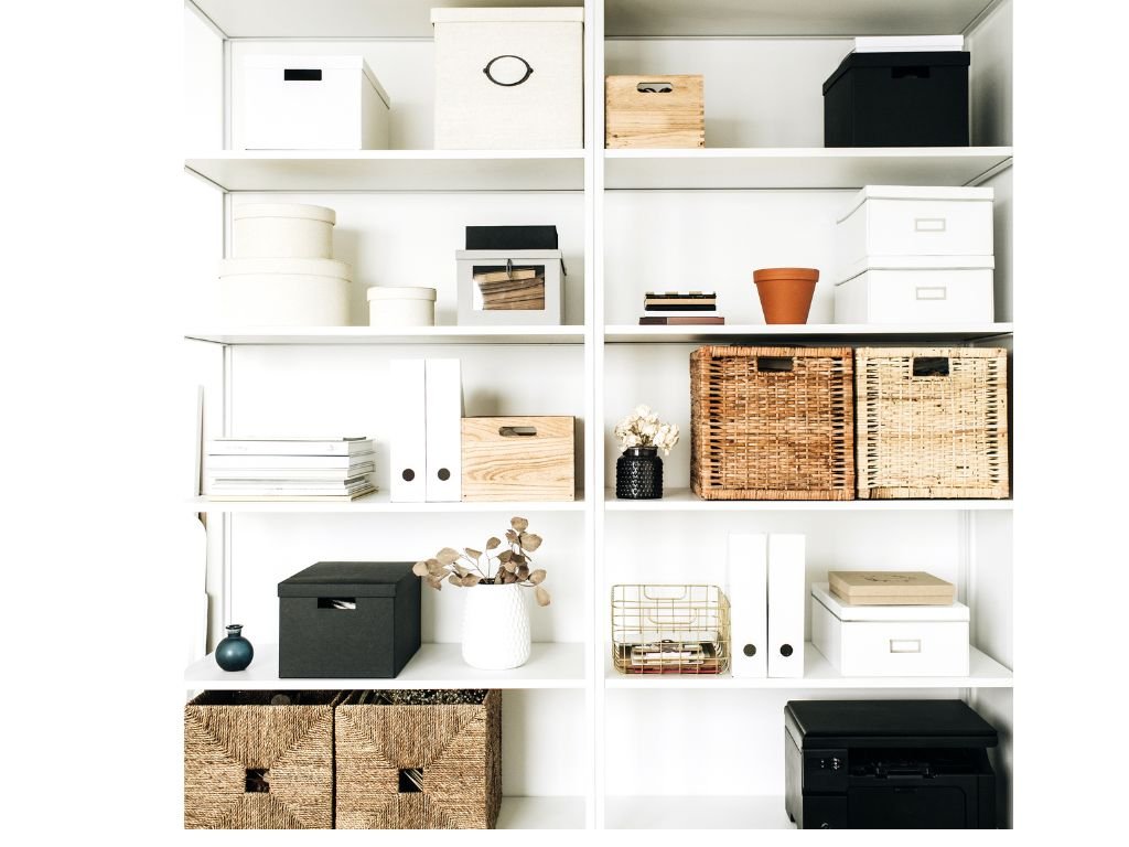 Add storage (boxes, shelves, carts, built-ins, closets) in the spaces where solutions are missing.